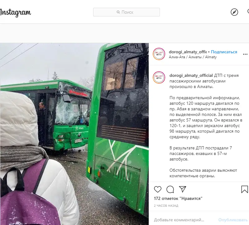 Алматы, NEGE. Жол апаты 18 ақпан күні түске дейін болған. Сейфуллин даңғылы мен Масанчи көшесінің қиылысында үш бірдей автобус жолдың тайғақтығынан дер кезінде тоқтай алмай, соқтығысқан. Көше қақтығысына ұшыраған үш автобус та батыс бағытта қозғалып бара жатқан. Жеті адам ауруханаға жеткізілді.