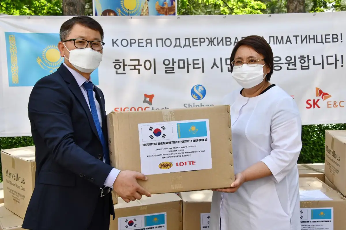 Алматы әкімдігіне гуманитарлық көмек аясында оңтүстіккореялық компаниялар тарапынан жеке қорғаныс құралдары жеткізілді. Оңтүстік Корея ізгілікті көмек көрсету шеңберінде коронавирустық инфекциямен күрес мақсатында Алматы қаласының Қоғамдық даму басқармасына және Тауарлар мен қызметтердің сапасы мен қауіпсіздігін бақылау департаментіне 1125 бірлік жеке қорғаныс құралдарын тапсырды.