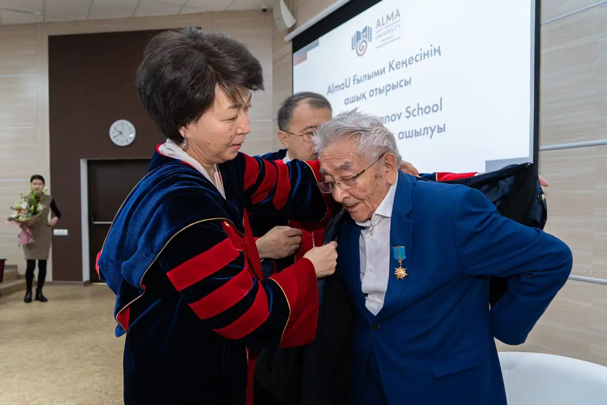 AlmaU ректоры Гүлнар Күренкеева Төрегелді Шарманұлының «Алматы менеджмент Университетінің Құрметті профессоры» атағын алғанын растайтын дипломды табыс етті. 92-ге келген ғалым өз есімімен аталған мектептің ашылуын зор жауапкершілік деп бағалады. Бұл жауапкершілікті үрім-бұтағы да сезінетінін тілге тиек етті.