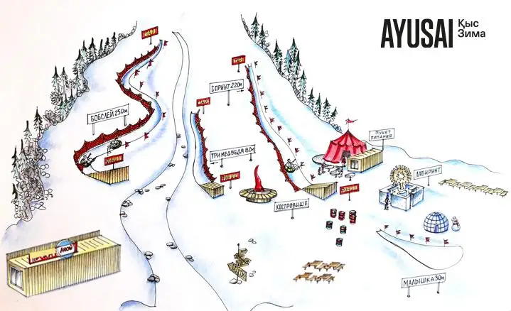 Ол үшін, «Аюсайдағы қыс» жобасы жарияланып, сырғанақтарды жабдықтауға «Адвантик Групп» компаниясы тартылған. Алайда, соңғы сәтте ұйымдастырушылар жобадан бас тартуға мәжбүр болып, сырғанақтар бастапқы күйінде қалатын болды. Сырғанақтарда тек сабан белдеуі жатады.
