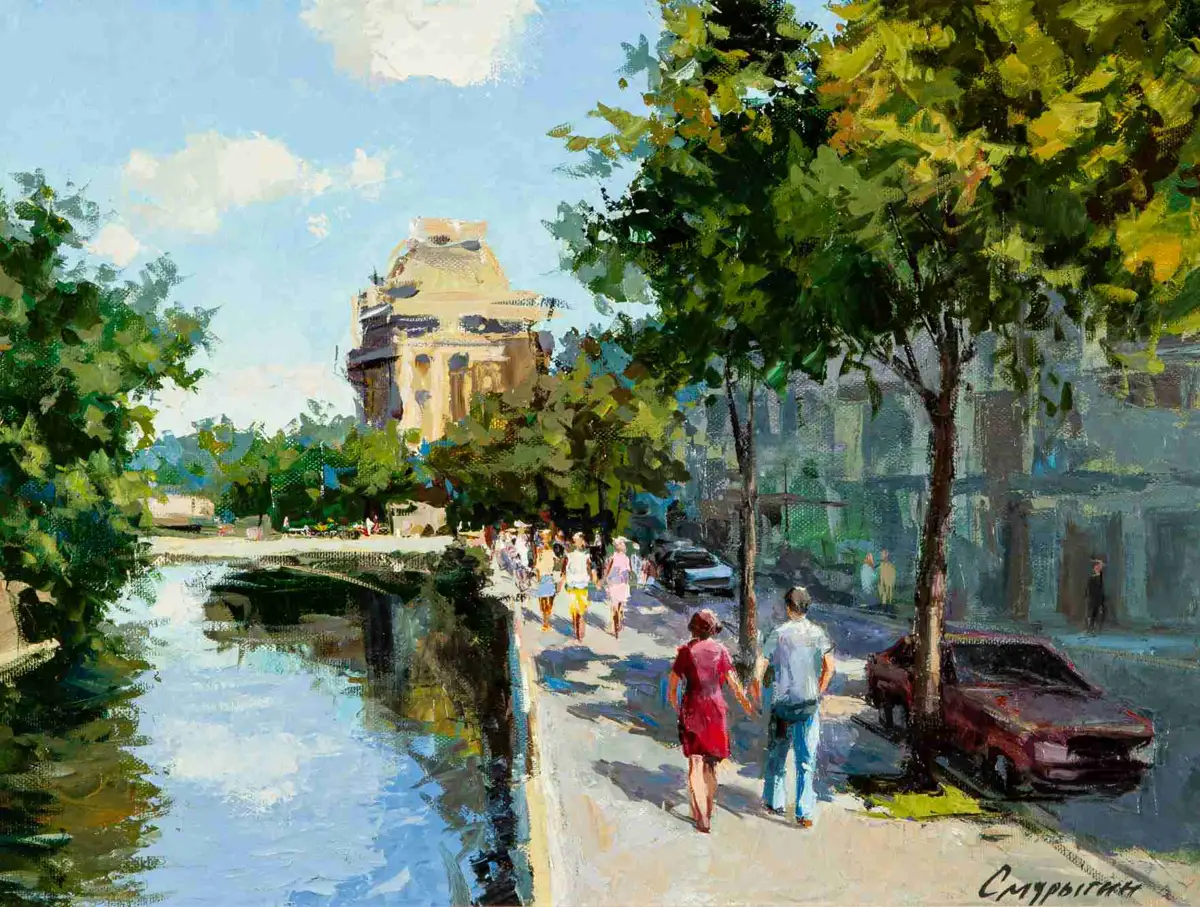 Сәттің әдемілігі, мәңгіліктің әдемілігі. Әрбір сәтте кішкентай өмір бар, эмоциялық екпінде немесе жанға батқан оқиғада сәттің жылы және дыбысты естелігі қалады. Бір сәтте көп нәрсе орын алады және ол өмірдің әдемілігі. Суретшінің бақыты дегеніміз ол сол сәттің жарқындығын өзінің кенебіне түсіре алатыны. Суретшінің қылқаламына бәрі бағынады. Қала әлі ұйқыға оранған кезде таңның атуын бейнелейді. Жылы бояулар шүйгін жапырақтардың реңктері мен түйіршікті дымқыл асфальттың суық бояуларымен қақтығысқаны, ашық қызғылт пен күлгін түстері таңғы күн