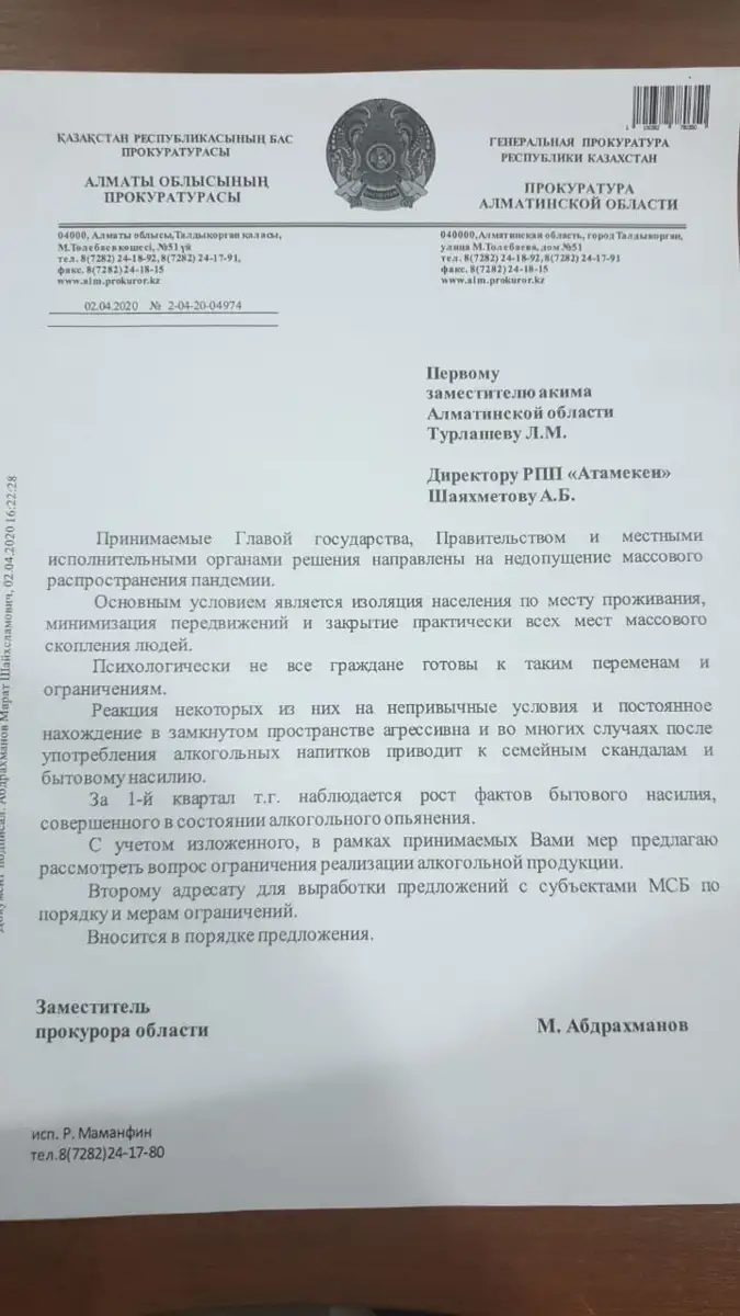 Онда облыс аумағында алкоголь сатуды шектеуді ұсынады. Себебі, карантин кезінде отбасылық кикілжің көп тіркелген. Яғни, бұрын-соңды үйде қамалып отырып көрмеген ер азаматтардың дені агрессиялық, тұрмыстық зорлық-зомбылық әрекетке барған. Мұның бәрі ішімдіктің салдарынан туындайтыны сөзсіз. «Сондықтан да артық жүріс-тұрысты шектеу, топырлап жиналуға жол бермеу керек. Осыған орай, алкоголь өнімдерін сатуды шектеу мәселесін қарастыруды ұсынамын» деген хатында Алматы облысы прокурорының орынбасары М.Әбдірахманов мырза.