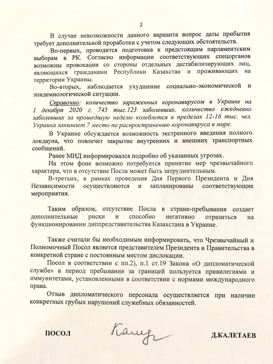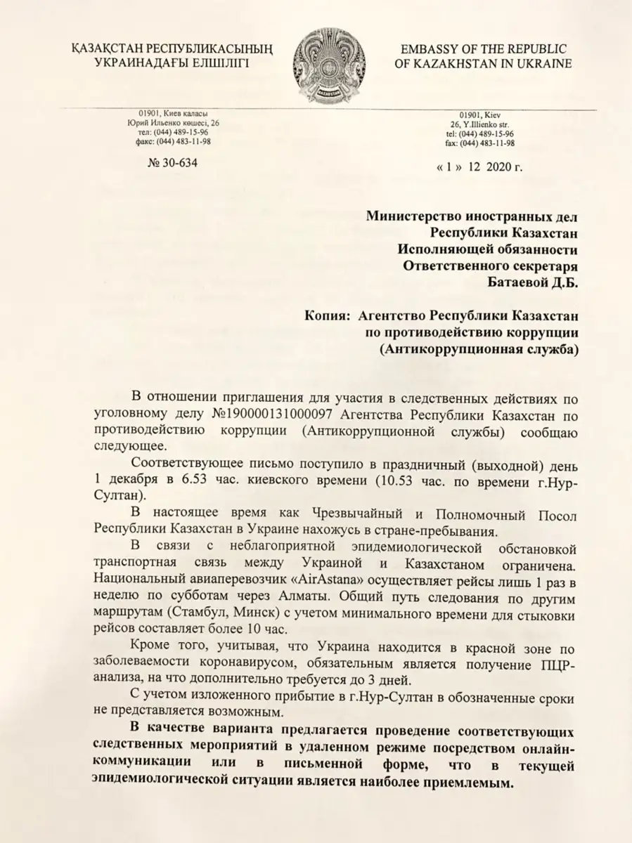 Сыбайлас жемқорлыққа қарсы іс-қимыл агенттігі әлдебір қылмыстық іске қатысты түсініктеме беруі үшін елші Дархан Қалетаевты елге шақыртқан. Алайда Қалетаев пандемияны және Украина мен Қазақстан арасында әуе рейстері сирегенін сылтау етіп, елге келуден бас тартқан. Бұдан бөлек, ол Қазақстан мен Украинадағы әлдебір күштердің арандату ұйымдастыруы мүмкін екенін, «Дипломатиялық қызмет туралы» заңды мысал етіп, «шетелде жүрген мерзімде дипломатиялық артықшылығы мен иммунитеті бар екенін» ескертеді.