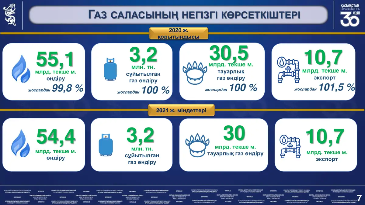 2020 жылы Қазақстан 55,1 миллиард текше метр газ өндірді. Ал биыл 54,4 миллиард текшеметр газ өндіруді жоспарлап отыр. Оның ішінен 10,7 миллиард текше метр газ экспортқа шығарылды.