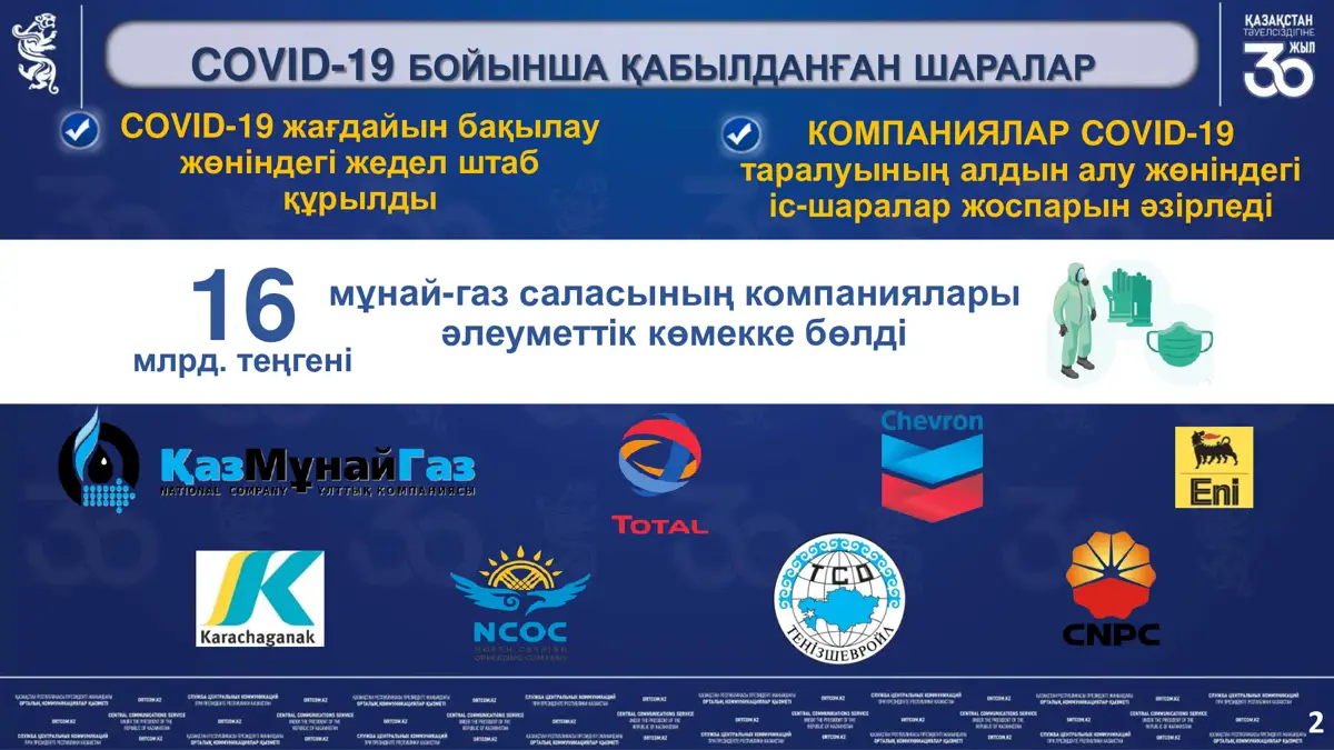 Онымен қоса, мұнай-газ саласындағы компаниялар коронавирустық инфекцияның таралуына қарсы күреске белсенді ат салысты. 2020 жылы олар әлеуметтік көмекке шамамен 16 миллиард теңге бөлді. Мұнай компанияларының көмегімен Атырау және Ақтау қалаларында модульдік инфекциялық ауруханалар, Құлсары қаласында көп бейінді аурухана кешені салынды. Қалған қаржыға медициналық жабдықтар, көлік пен материалдар сатып алынды.