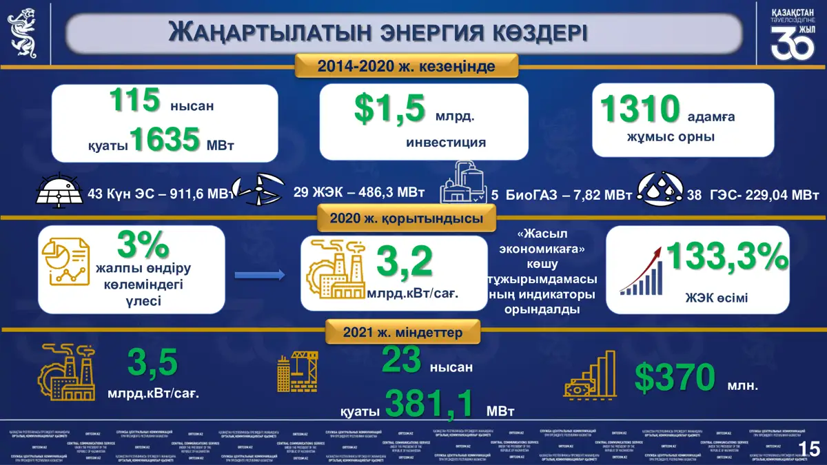 Бұл – болашақтағы басты сала. Көмірсутек дәуірі кетіп барады. Қазақстан осы үрдістен артта қалғысы келмейді. 2020 жылы елдің жалпы энергия теңгеріміндегі жаңартылатын энергия көздерінің үлесі 3 пайызға жетті. Соңғы 5 жылда жаңартылатын энергия көздерінің қуаты 7 есеге өсті. Қазір Қазақстан күн, су мен желден 1635 МВт қуат алады. Жасыл энергияны өндіретін 115 нысан жұмыс істейді.