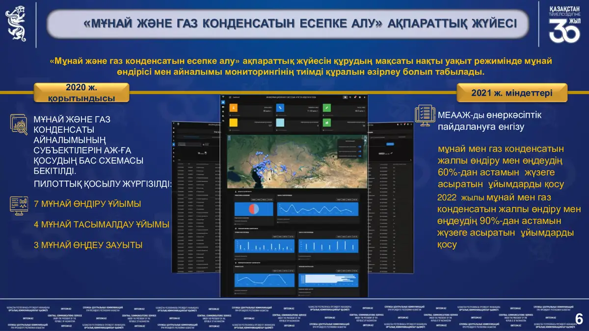 Сонда биыл мұнай мен газ конденсатын есепке алудың ақпараттық жүйесі өнеркәсіптік пайдалануға беріледі. Әрі мұнай мен газ конденсатын өндіріп, өңдейтін кәсіпорындардың 60%-дан астамы осы жүйеге қосылатын болады.