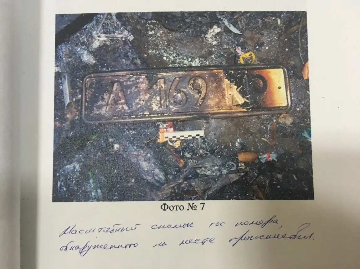 Өртенген джип пен оның мемлекеттік нөмірі.