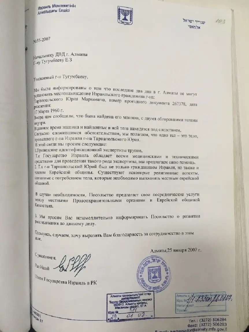 Израиль елшісінің полиция басшылығына жолдаған хаты. Фото: Қылмыстық істен.