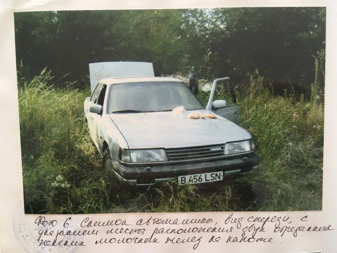 Талдықорған қаласының шетінен табылған ескі «Мазданың» іші және айналасы адам қанына бөгіпті. Капотта ашылған чипсы қорабы, нан қоқымы және әйелдің үрпісі жоқ кесілген емшегі жатқан.