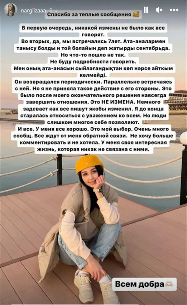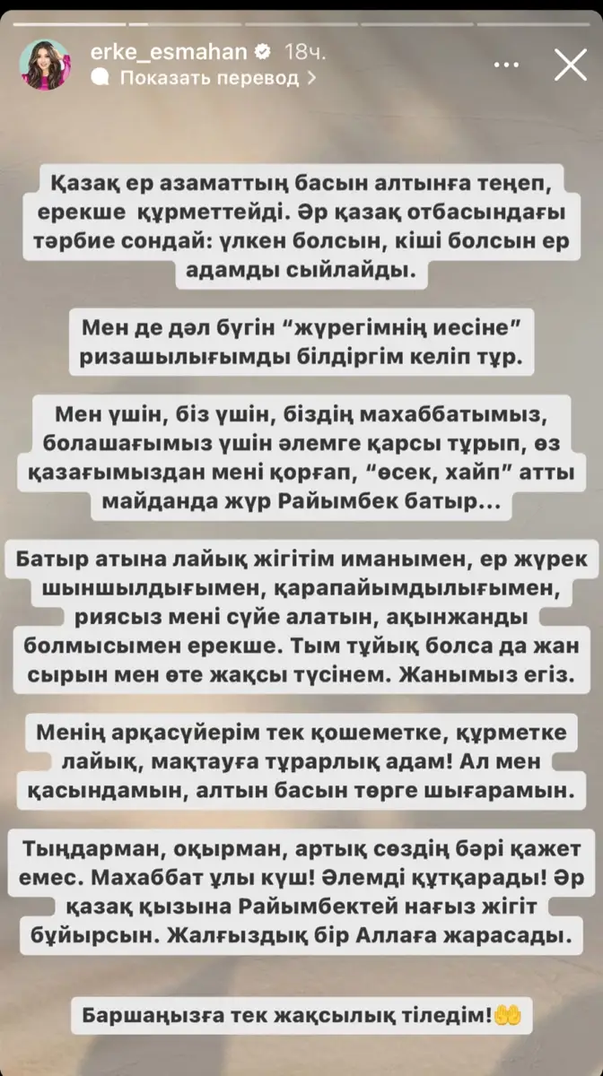 Алматы, NEGE. "Қазақ ер азаматтың басын алтынға теңеп, ерекше құрметтейді. Әр қазақ отбасында тәрбие сондай: үлкен болсын, кіші болсын ер адамды сыйлайды. Мен дәл бүгін "жүрегімнің иесіне" ризашылығымды білдіргім келіп тұр. Мен үшін, біз үшін, біздің махаббатымыз, болашағымыз үшін әлемге қарсы тұрып, өз қазағымыздан мені қорғап, "өсек", "хайп" атты майданда жүр Райымбек батыр. Батыр атына лайық жігітім иманымен, ер жүрек шыншылдығымен, қарапайымдылығымен, риясыз мені сүйе алатын, ақынжанды болмысымен ерекше. Тым тұйық болса да, жан сырын мен өте жақсы түсінемін. Жанымыз егіз.