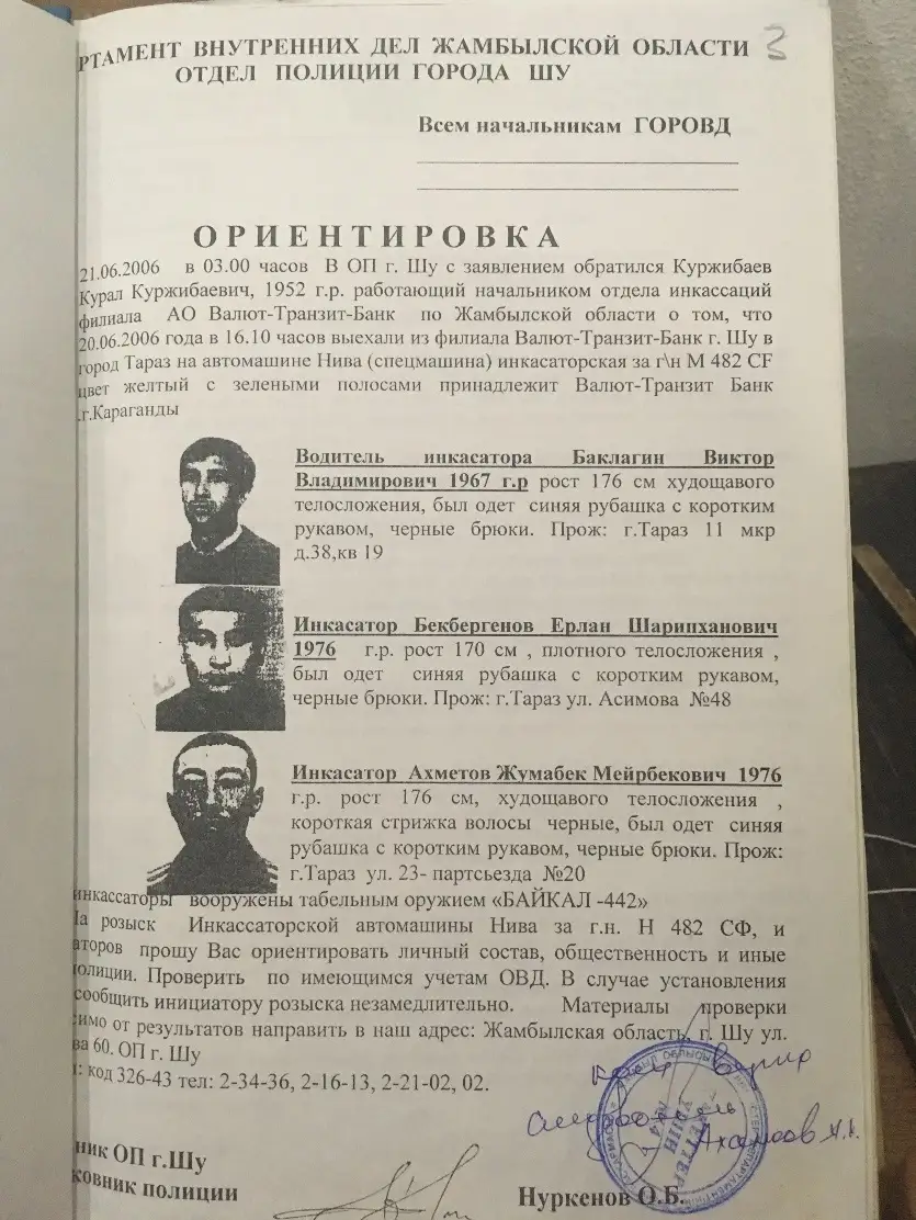 2006 жылғы оқиғаға қайта оралайық. 2006 жылы 20 маусымда үш инкассатор – Виктор Баклагин, Ерлан Бекбергенов және Жұмабек Ахметов мемлекеттік нөмірі М 482 CF «Нива» қызметтік көлігімен Шу қаласынан Таразға шығады. Олар соңғы рет кеңсемен 14:20-да, Шу бөлімшесінен шығарда хабарласқан. Кешкі 19:00-ге дейін келуі тиіс көлік сол күйі жетпеді. Күзетшілердің ұялы телефондары өшіп тұрды. Алғашқыда банктің қауіпсіздік қызметі жоғалған көлік пен қызметкерлерін өз күшімен іздемек болған. Алайда мұнысынан ештеңе шықпағандықтан полицияға хабар береді.