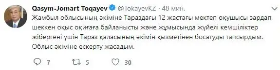 «Жамбыл облысының әкіміне Тараздағы 12 жастағы мектеп оқушысы зардап шеккен оқыс оқиғаға байланысты және жұмысында жүйелі кемшіліктер жібергені үшін Тараз қаласының әкімін жұмысынан босатуды тапсырдым. Облыс әкіміне ескерту жасадым».