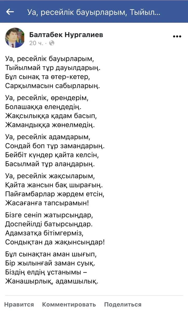 Ақын Балтабек Нұрғалиев ресейліктерге арнаған өлеңін фейсбуктегі парақшасында жариялаған.